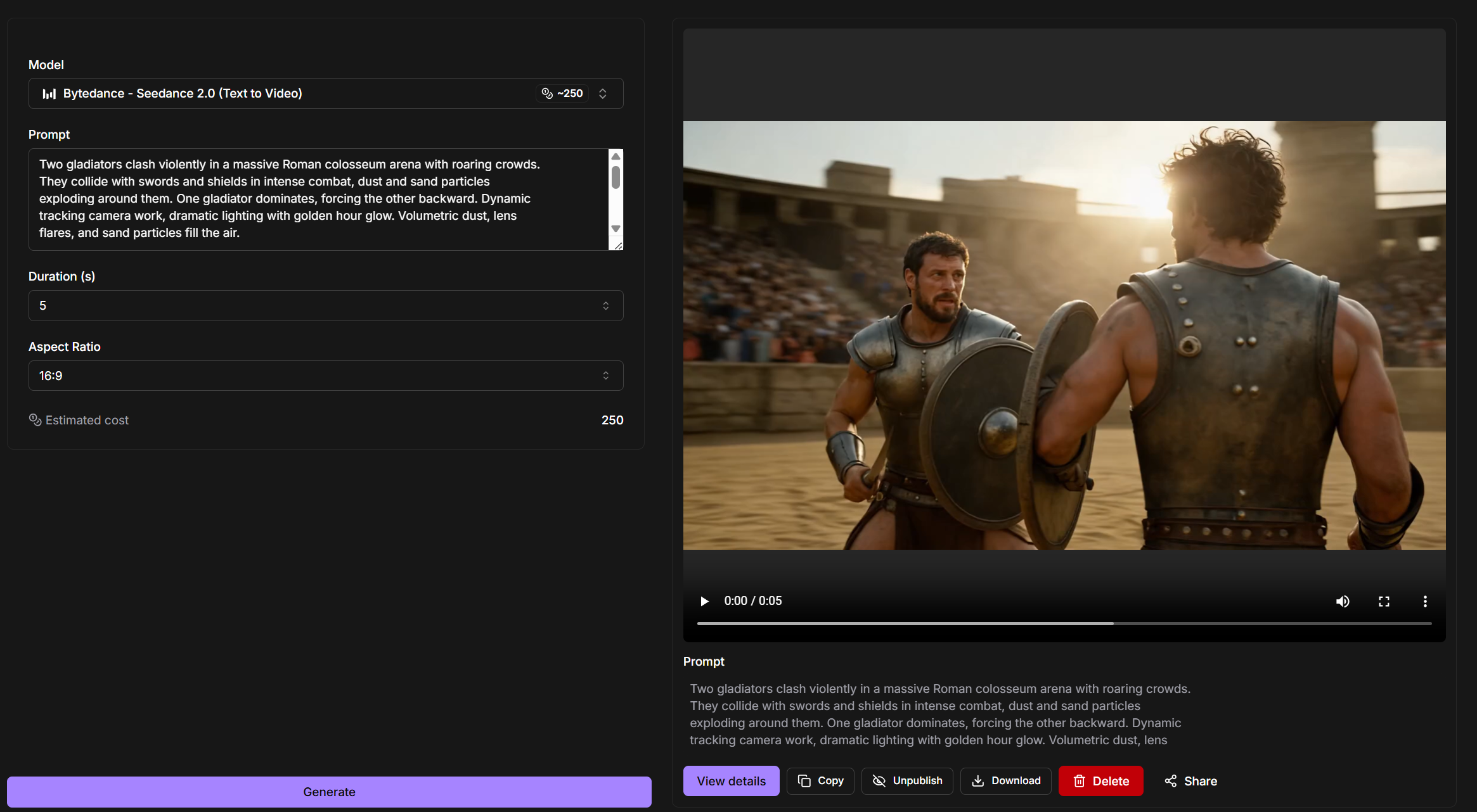 Two gladiators clash violently in a massive Roman colosseum arena with roaring crowds. They collide with swords and shields in intense combat, dust and sand particles exploding around them. One gladiator dominates, forcing the other backward. Dynamic tracking camera work, dramatic lighting with golden hour glow. Volumetric dust, lens flares, and sand particles fill the air. TECHNICAL SPECS: - Duration: 5 seconds - Style: Cinematic, Hollywood blockbuster, 4K, dramatic lighting - Camera: Dynamic tracking shots around the fighters - Effects: Volumetric dust, sand particles, lens flares, dramatic shadows - Audio: Epic orchestral score with sword clashes and crowd roars - Constraints: Realistic physics, smooth motion, no flicker, high consistency